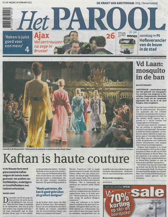 In februari 2011 produceerde ik samen met collega’s van het Prins Claus Fonds een catwalkshow in De Nieuwe Kerk. In deze show met de titel Kaftan als Couture werden creaties van de Marokkaanse ontwerpster Zhor Raïs gecombineerd met werken van jonge Amsterdamse ontwerpers. Deze productie was tevens de start van een succesvolle samenwerking met Marian Duff en Richard Soesanna van MAFB.